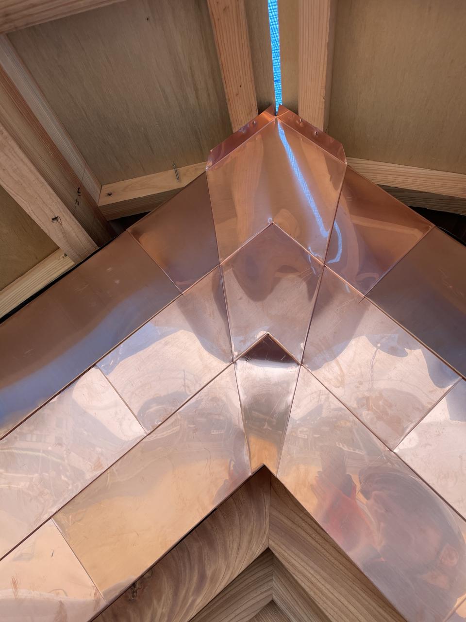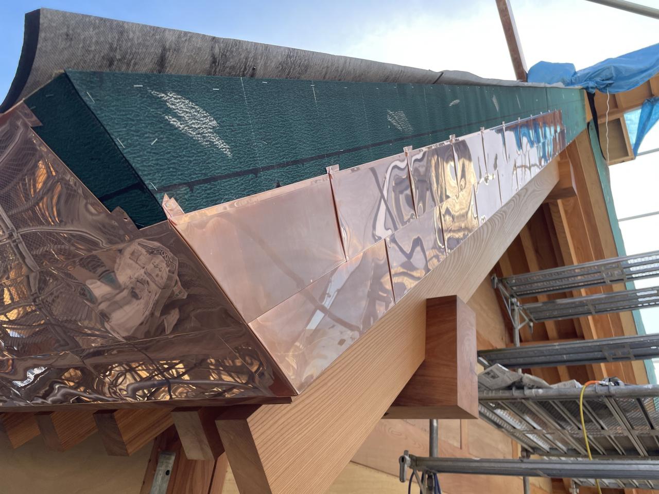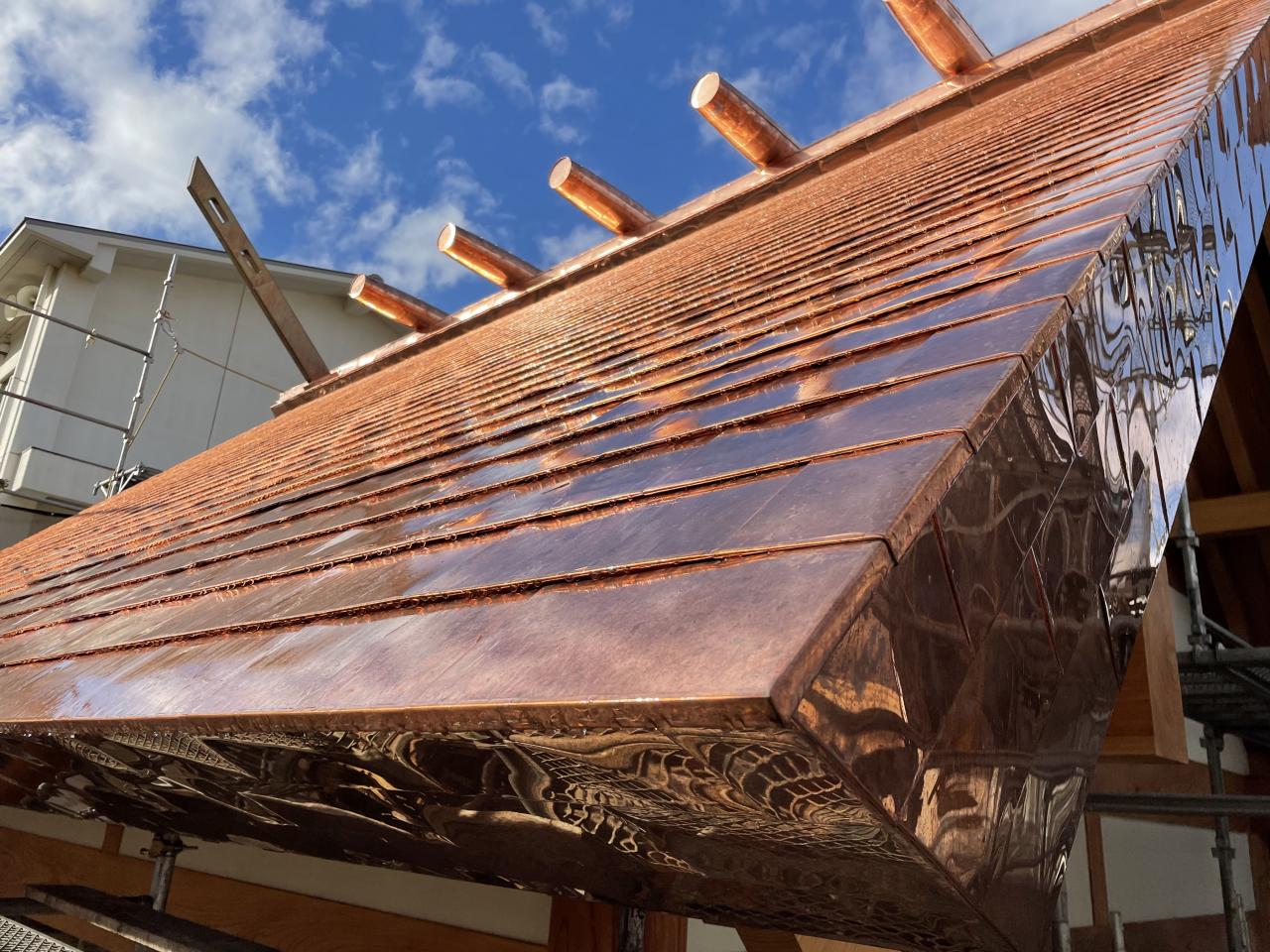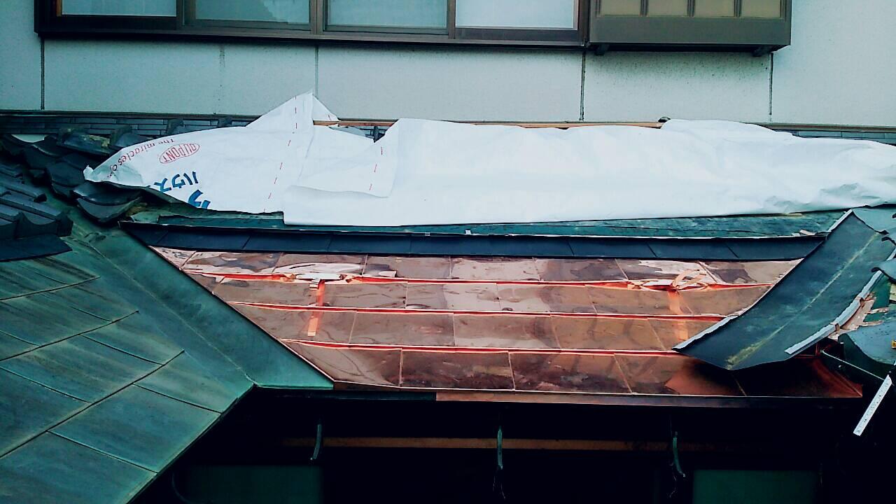 瓦との取り合い部に穴が開き雨漏りするとの事で一度取り合い部の修理をされてるのですが谷との取り合いもあり経年劣化で銅板が弱ってきてるので、とりあえず ややこしい部分のみ葺き替え。