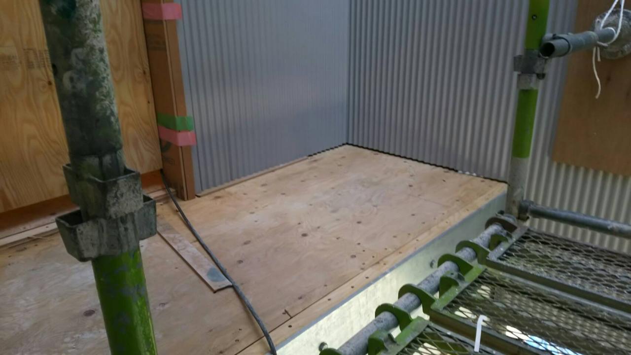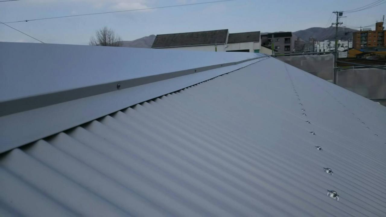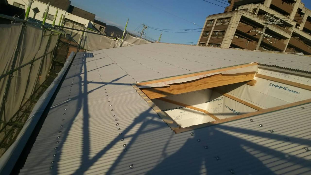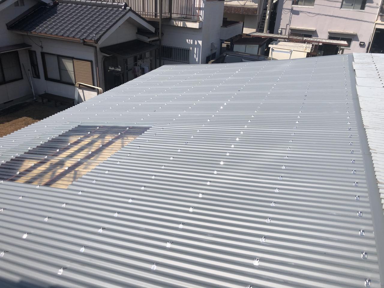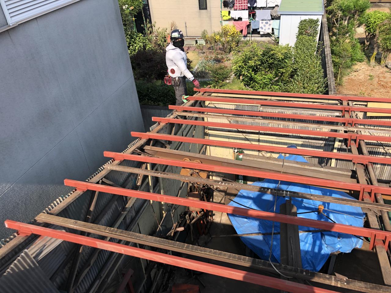 写真撮り忘れましたが、既存屋根は施主様が建物から建てられ屋根が錆びると上から重ねて貼られてて5枚重ねになってたのを、めくり 母屋からやり直しして隣接建屋同様に大波板・明かり取りで施工しました。