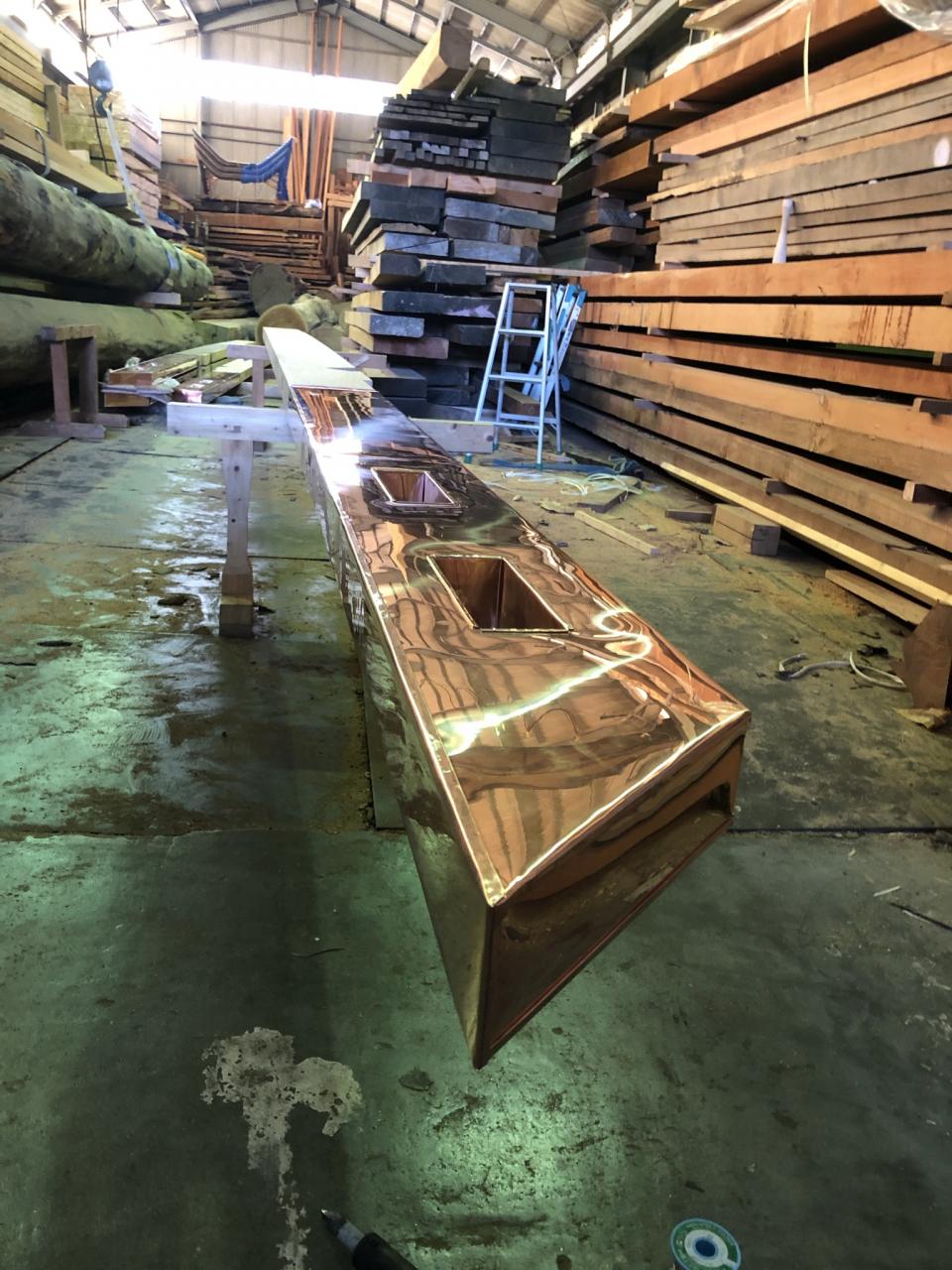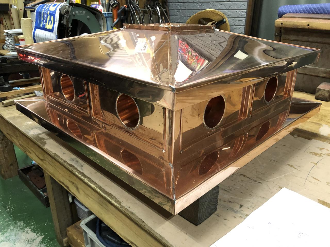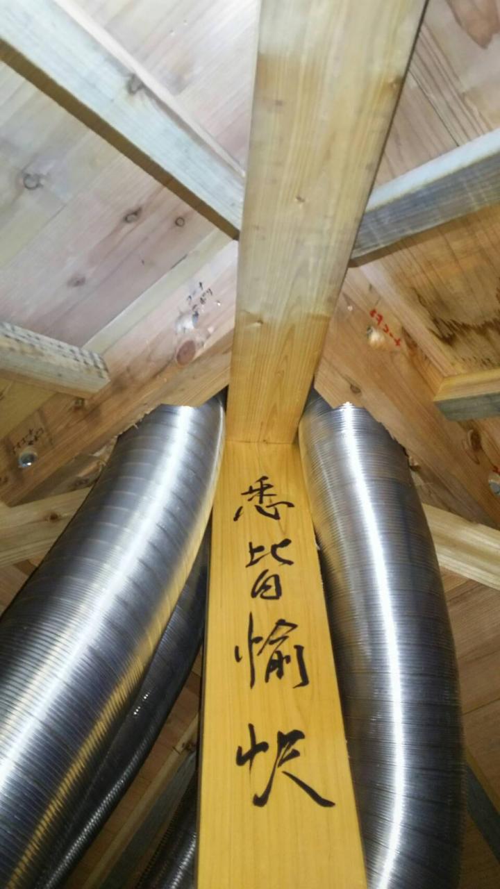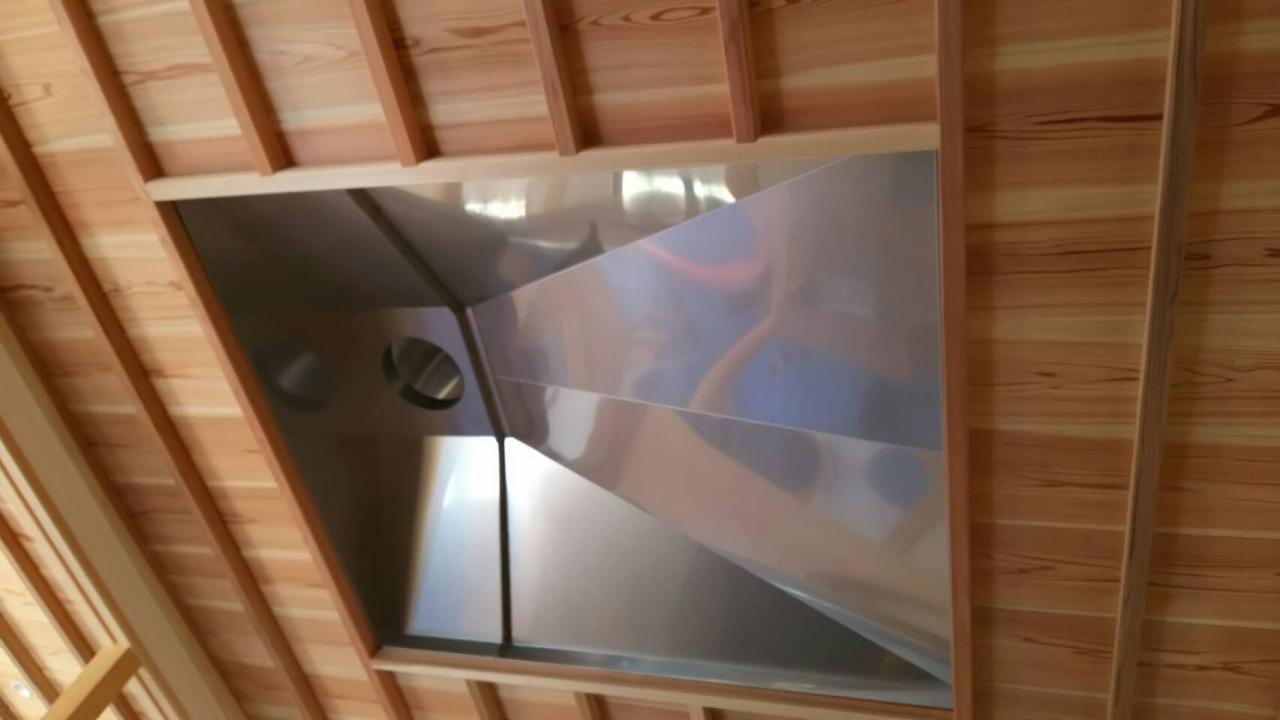 屋根上宝珠台に排煙細工をし、格天井にステンフード2270×2040という特大サイズのフード取り付け天井裏に分配ボックスを付けて宝珠台に抜く作業‼︎