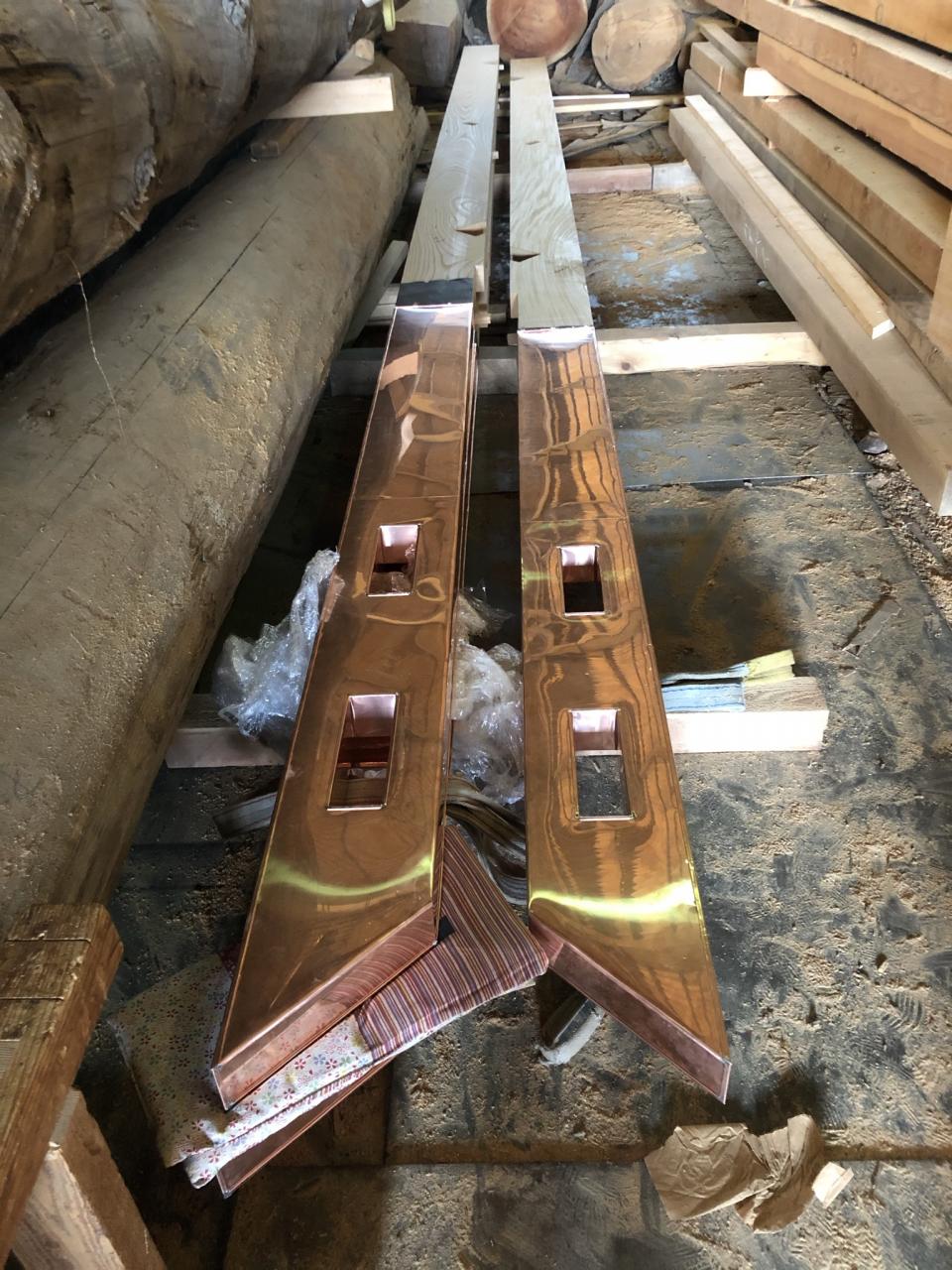 破風板と千木が繋がってるので棟上げ前に施工