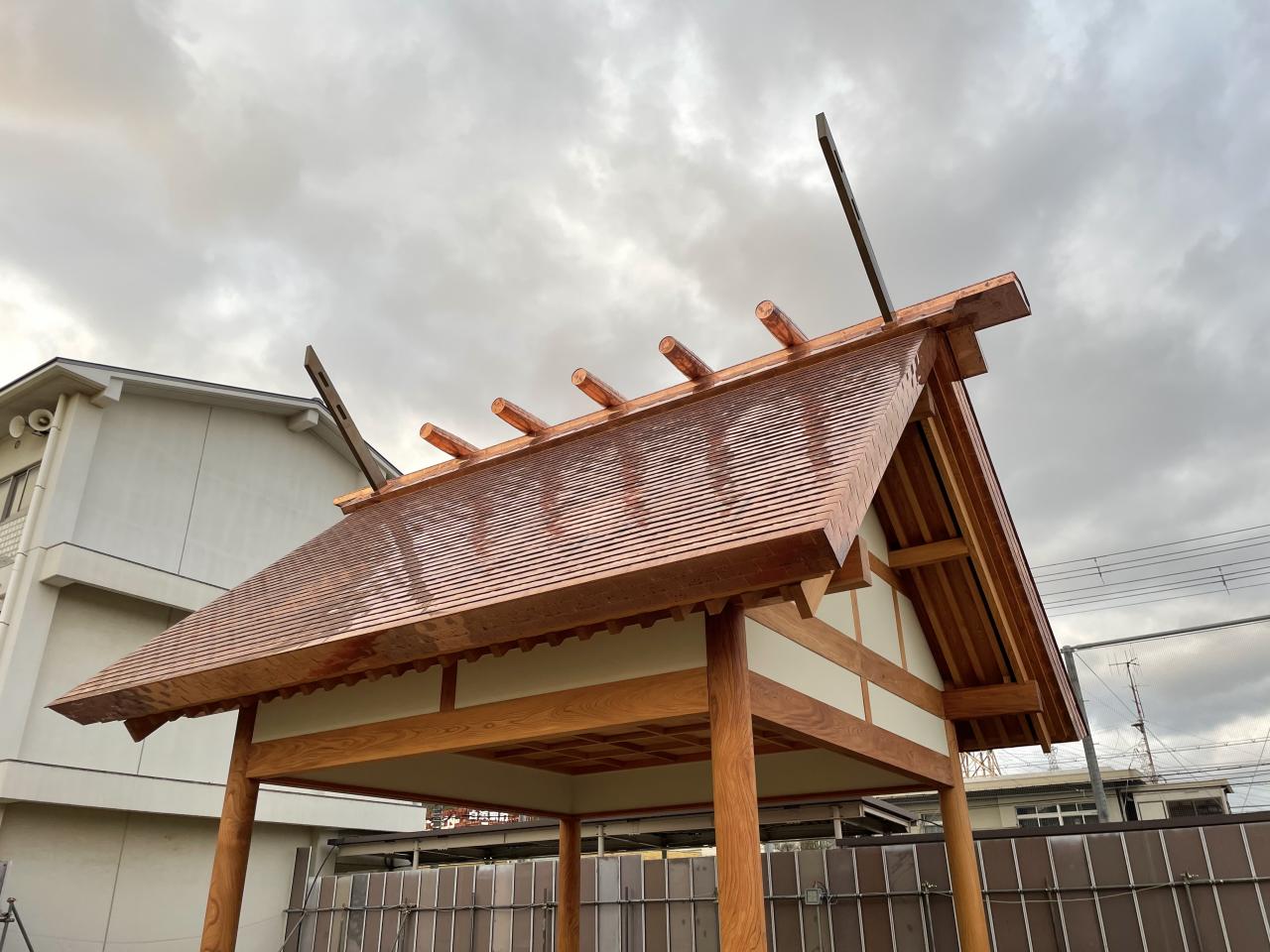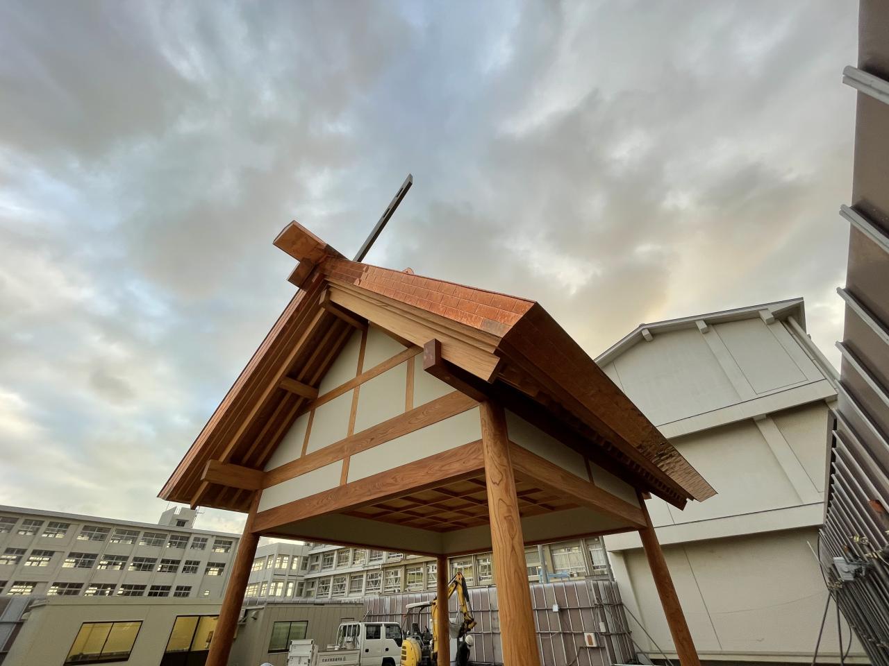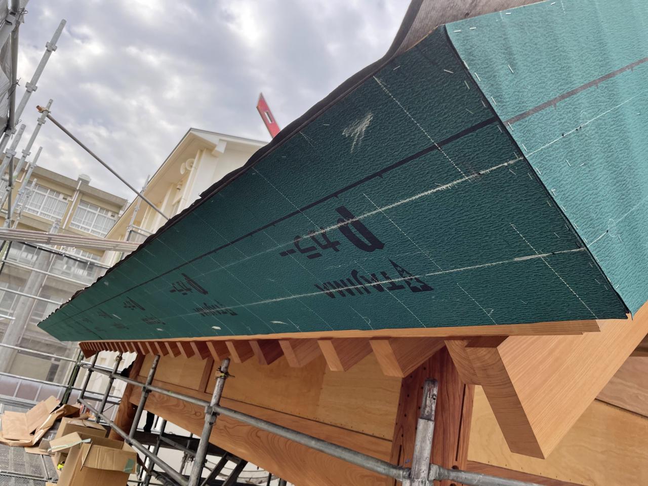 年末から加工してた、地元小学校相撲場の軒付を取り付け いよいよ明日から一文字葺きをスタート➰